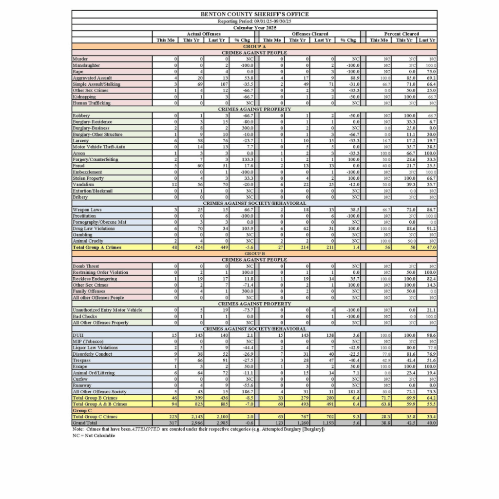 Benton County Sheriff’s Office Monthly Crime Stats